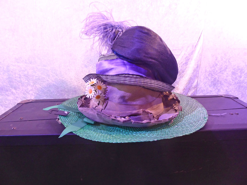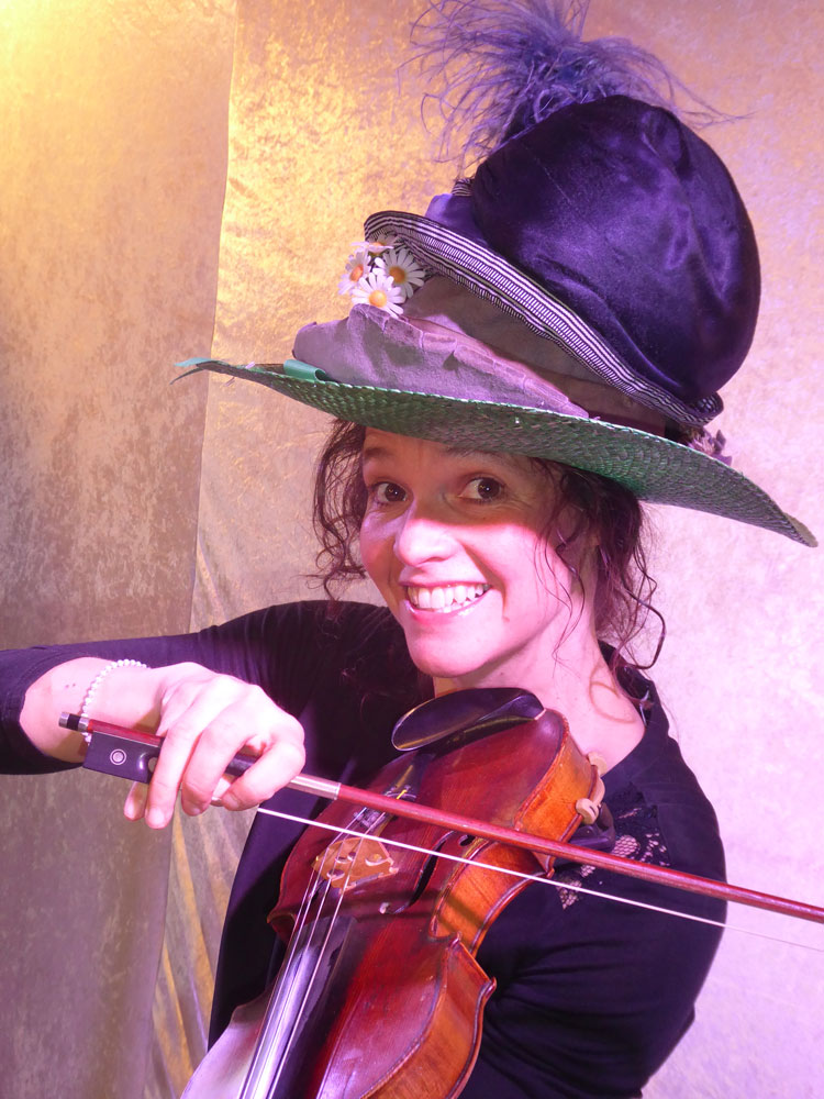 Annette Démarais- Stickel erzählt die wunderschöne Geschichte mit vier ganz verschiedenen Hüten, einem riesigen Überseekoffer und ihrer Geige.
