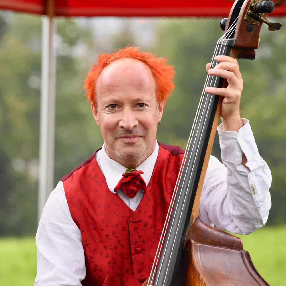 Pascal est à la contrebasse et Annette au violon et à l’accordéon.